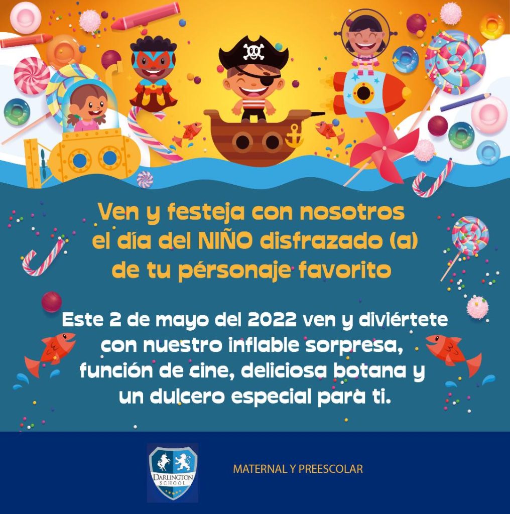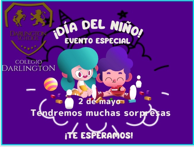 Estimada comunidad Darlington, se les hace una invitación a nuestros alumnos de maternal, kinder y primaria para nuestras actividades del día de Niño, ¡donde habrá muchas sorpresas para ellos!