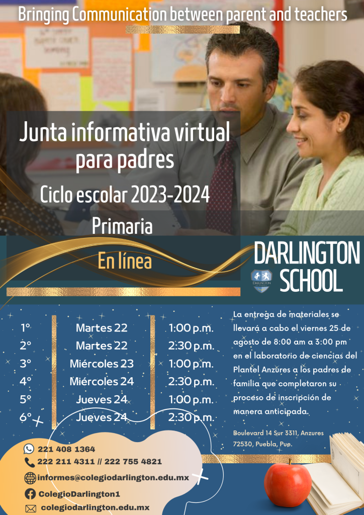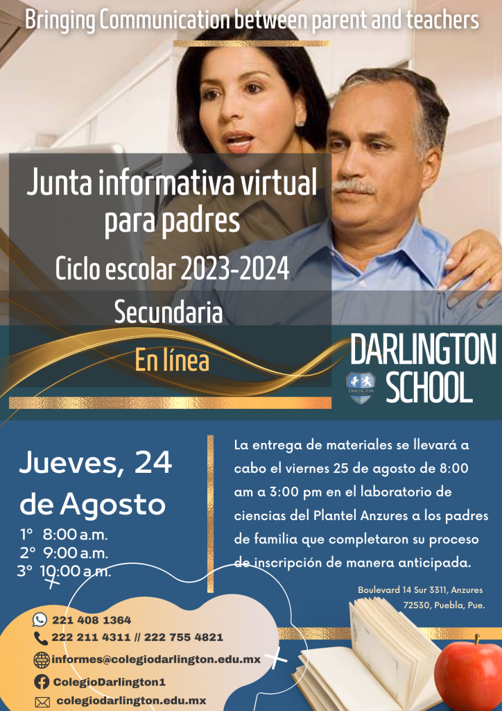 ¡Las juntas informativas del Colegio Darlington se acercan! Estén pendientes de los correos que han sido enviados con las ligas para las reuniones virtuales.