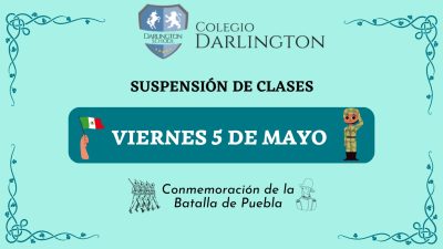 Muy buenos días a la comunidad Darlington, el viernes 5 de mayo de mayo de 2023 se suspenderán labores docentes por la conmemoración de la batalla de Puebla, marcado en el calendario oficial de la SEP.